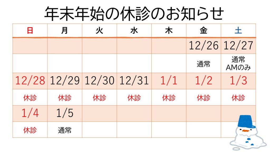 2025年の診療は12月27日(土)の午前まで、2026年の診療は1月5日(月)からとさせて頂きます。
