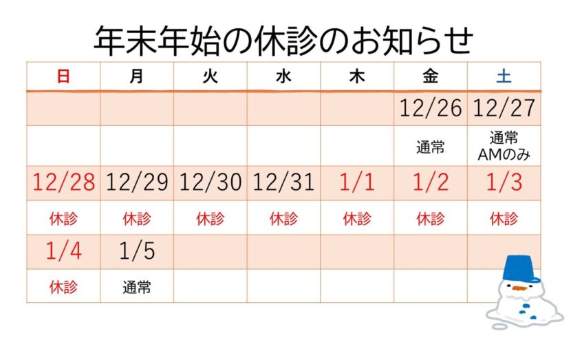 2025年の診療は12月27日(土)の午前まで、2026年の診療は1月5日(月)からとさせて頂きます。